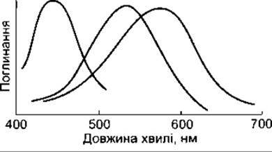 Рис. 8-26. Спектри поглинання трьох типів колбочкових піґментів сітківки людини. Піґмент S з піком поглинання 440 нм забезпечує сприйняття синього, а піґмент М з піком поглинання 535 нм - зеленого кольорів. Піґмент L з піком поглинання 565 нм (жовтий колір спектра) сприймає також довгі хвилі червоної частини спектра (відтворено за дозволом з Michael CR: Color vision. N Engl J Med 1973;288:724).