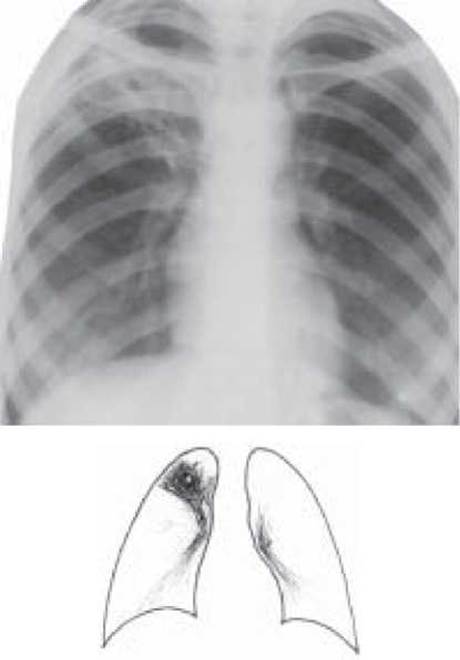Рис. 17. Інфільтративний туберкульоз верхньої частки правої Легені, фаза розпаду. Оглядова рентгенограма