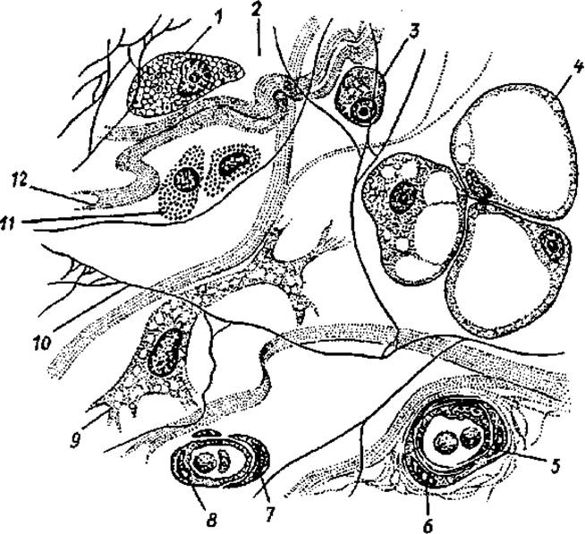 1 — макрофаг, 2 — аморфное межклеточное (основное) вещество, 3 — плазмоцит (плазматическая Клетка), 4 — липоцит (жировая клетка), 5 — кровеносный сосуд, 6 — миоцит, 7 — перицит, 8 — эндотелиоцит, 9 — фибробласт, 10 — эластическое волокно, 11 — тканевый базофил, 12 — коллагеновое волокно