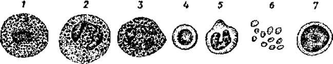 1 — базофильный гранулоцит, 2 — ацидофильный гранулоцит, 3 — сегментоядерный нейтрофильный гранулоцит, 4 — эритроцит, 5 — моноцит, 6 — тромбоциты, 7 — лимфоцит