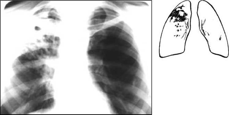 При рентгенологічному дослідженні в легенях знаходять неоднорідну тінь, частіше у верхній частці легень (рис. 18) або в прикореневій ділянці, що відповідає верхівці нижньої частки. Коли інфільтрат розпадається, в його центральній ділянці видно просвітлення неправильної або округлої форми (каверну). Типовими для туберкульозного інфільтрату є дрібні вогнищеві тіні навколо нього або в іншій легені (вогнища бронхогенного обсіювання). В таких випадках встановлюють діагноз інфільтративного туберкульозу легень у фазі розпаду і обсіювання.