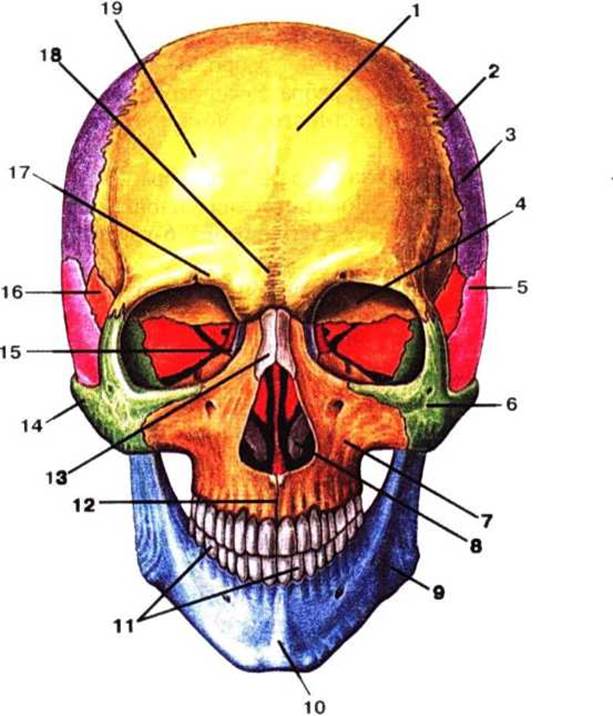 1-os frontale; 2-sutura coronalis; 3-os parietale; 4-orbita; 5-pars squamosa (ossis temporalis); 6-os zygomaticum; 7-maxilla; 8-apertura piriformis; 9-mandibula; 10-tuberculum mentale; 11-denies mandibulae; 12-sutura intermaxillaris; 13-os nasale; 14-arcus zygomaticum; 15-os lacrimale; 16-ala major osis sphenoidalis; 17-arcussuperciliaris; 18-glabella; 19-tuber frontale.