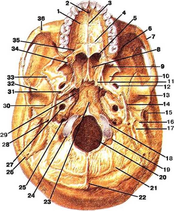 1-processus palatinus maxillae; 2-foramen incisivum; 3-sutura palatina mediana; 4-sutura palatina transversa; 5-choana; 6-fissura orbitalis inferior; 7-arcus zygomaticus; 8-ala vomeris; 9-fossa pterygoidea; 10-lamina lateralis processus pterygoidei; 11-processus pterygoideus; 12-foramen ovale; 13-fossa mandibularis; 14-processus styloideus; 15-meatus acusticus externus; 16-processus mastoideus; 17-incisura mastoidea; 18-condylus occipitalis; 19-fossa condylaris; 20-foramen magnum; 21-linea nuchalis inferior; 22-protu-berantia occipitalis externa; 23-tuberculum pharyngeum; 24-canalis condylaris; 25-foramenjugulare; 26-sutura occipitomastoidea; 27-apertura externa canalis carotici; 28-foramen stylomastoideum; 29-foramen lacerum; 30-fissura petrotympanica; 31-foramen spinosum; 32-tuberculum articulare; 33-sutura sphenosquamosa; 34-hamulus pterygoideus; 35-foramen palatinum majus; 36-sutura zygomaticomaxillaris.