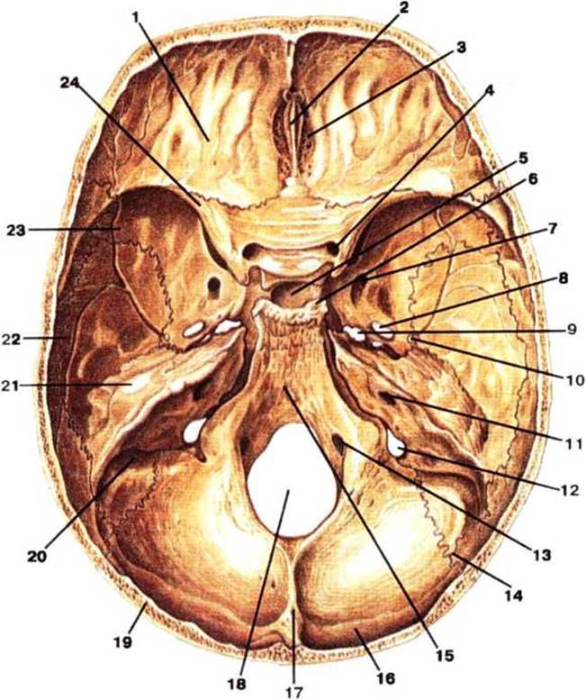 1-pare orbitalis ossis frontalis; 2-crista galli; 3-lamina cribrosa; 4-canalis opticus; 5-fossa hypophysialis; 6-dorsum sellae; 7-foramen rotundum; 8-fora-men ovale; 9-foramen laceram; 10-foramen spinosum; 11-porus acusticus internus; 12-foramen jugulare; 13-canalis nervi hypoglossi; 14-sutura lamb-doidea; 15-clivus; 16-sulcus sinus transversi; 17-protuberantia occipitalis interna; 18-foramen magnum; 19-squama occipitalis; 20-sulcus sinus sig-moidei; 21-pars petrosa ossis temporalis; 22-pare squamosa ossis temporalis; 23-ala major ossis sphenoidalis; 24-ala minor ossis sphenoidalis.