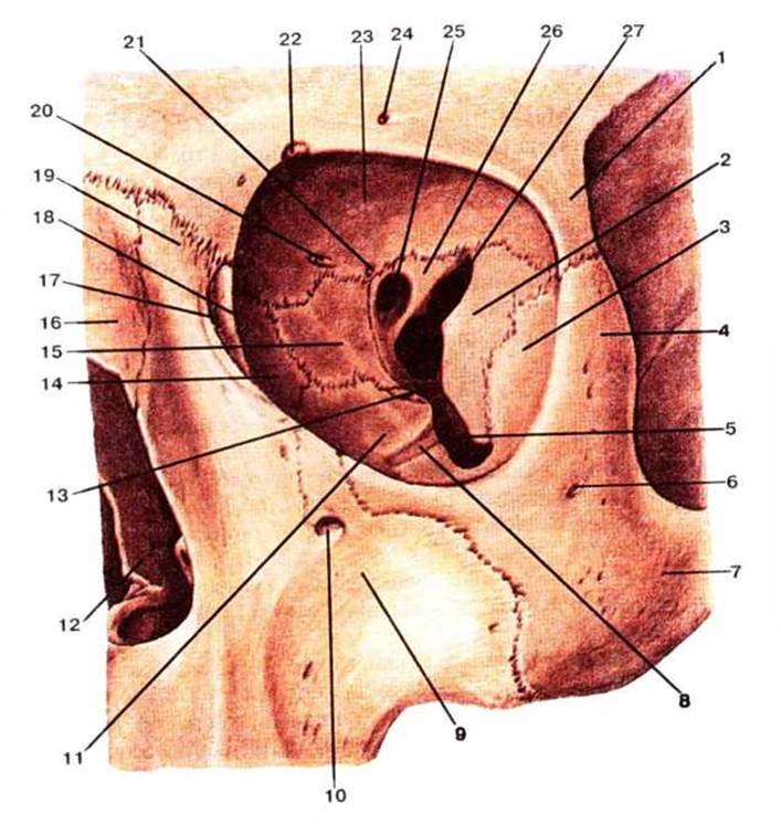 3-facies orbitalis ossis zygomatici; 4-processus frontalis ossis zygo-matici; 5-fissura orbitalis inferior; 6-foramen zygomaticofaciale; 7-os zygo-maticum; 8-sulcus infraorbitalis; 9-maxilla; 10-foramen infraorbitale; 11-facies orbitalis maxillae; 12-cavum nasi; 13-processus orbitalis ossis palatini; 14-oslacrimale; 15-lamina orbitalis ossis ethmoidalis; 16-osnasale; 17-sulcus lacrimalis; 18-crista lacrimalis posterior; 19-processus frontalis maxillae; 20-foramen ethmoidale anterius; 21-foramen ethmoidale posterius; 22-incisura frontalis; 23-facies orbitalis ossis frontalis; 24-foramen supraorbitalis; 25-canalis opticus; 26-ala minor ossis sphenoidalis; 27-fissura orbitalis superior.