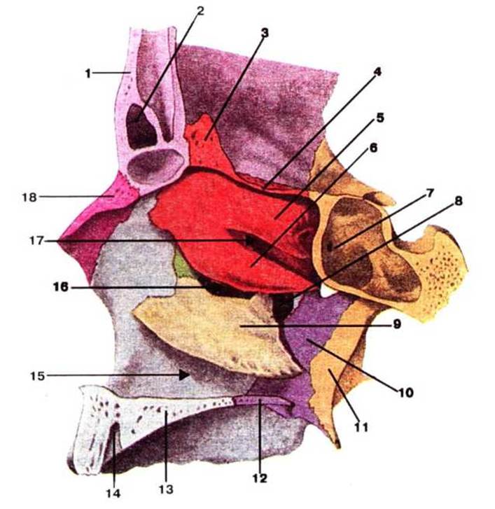 1-os frontale (squama frontalis); 2-sinus frontalis; 3-crista galli; 4-lamina cribrosa ossis ethmoidalis; 5-concha nasalis superior; 6-concha nasalis media; 7-sinus sphenoidalis; 8-foramen sphenopalatinum; 9-concha nasalis inferior; 10-lamina peфendicularis ossis palatini; 11-lamina medialis processus pterygoidei; 12-lamina horizontalis ossis palatini; 13-processus palatinus maxillae; 14-canalis incisivus; 15-meatus nasi inferior; 16-meatus nasi medius; 17-meatus nasi superior; 18-osnasale.