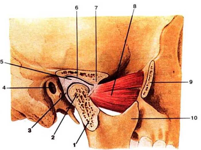 1-processus articularis (condylaris) mandibulae; 2-caput mandibulae; 3-capsula articularis; 4-porus acusticus externus; 5-discus articularis; 6-fossa mandibularis; 7-tuberculum articulare; 8-m.pterygoideus lateralis; 9-processus temporalis ossis zygomatici; 10-processus coronoideus.