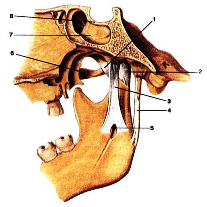 Малюнок 10. Скронево-нижньощелепний суглоб. Присередня поверхня. 1-ligamentum laterale (articulatio temporomandibularis); 2-capsula articula-tionis temporomandibularis; 3-ligamentum sphenomandibulare; 4-Iigamen-tum stylomandibulare; 5-foramen mandibulae; 6-arcus zygomaticus; 7-sinus sphenoidalis; 8-fossa hypophysialis.