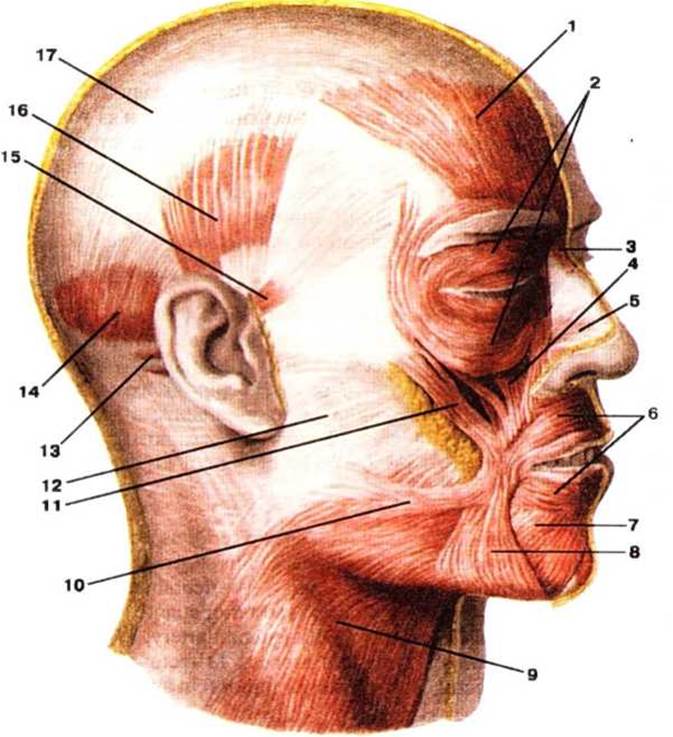 1-venter frontalis m.occipitofrontalis; 2-m.orbicularis oculi; 3-m.procerus; 4-m.levator labii superioris; 5-m.nasalis (pars alaris); 6-m.orbicularis oris; 7-m.depressor labii inferioris; 8-m.depressor anguli oris; 9-platysma; 10-m.risorius; 11-m.zygomaticus major; 12-fascia masseterica; 13-m.auricu-laris posterior; 14-venter occipitalis m.occipitofrontalis; 15-m.auricularis anterior; 16-m.auricularis superior; 17-galea aponeurotica (aponeurosis epicranialis) m.occipitofrontalis.
