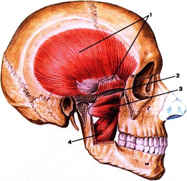 1-m.temporalis; 2-m.pterygoideus lateralis (caput superius); 3-m.ptery-goideus lateralis (caput inferius); 4-m.pterygoideus medialis.