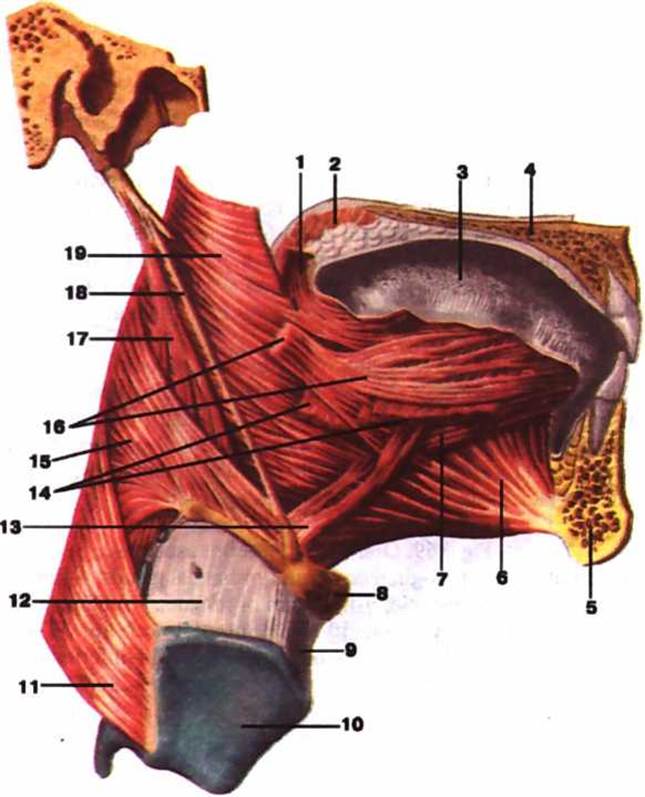1-m.palatoglossus; 2-palatum molle; 3-lingua; 4-palatum durum; 5-mandibula (отрезана); 6-m.genioglossus; 7-m.longitudinalis inferior (linguae); 8-os hyoideum; 9-ligamentum thyrohyoideum medianum; 10-cartila-go thyroidea; 11-m.constrictor pharyngis inferior; 12-membrana thyrohy-oidea; 13-m.chondroglossus; 14-m.hyoglossus; 15-m.constrictor pharyngis medius; 16-m.styloglossus; 17-m.stylopharyngeus; 18-ligamentumstylohy-oideum; 19-m.constrictor pharyngis superior.
