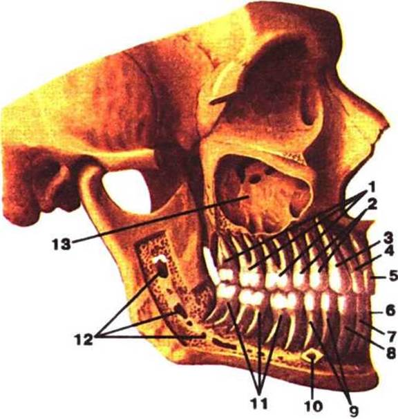 1-dentes molares superiores; 2-dentes premolares superiores; 3-dens caninus superior; 4-dens incisivus lateralis superior; 5-dens incisivus medialis superior; 6-dens incisivus medialis inferior; 7-dens incisivus lateralis inferior; 8-dens caninus inferior; 9-dentes premolares inferiores; 10-foramen mentale; 11-dentes molares inferiores; 12-canalis mandibulae; 13-sinus maxillae.