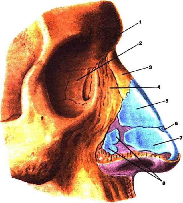 1-os frontale; 2-os lacrimale; 3-os nasale; 4-processus frontalis maxillae; 5-cartilago nasi lateralis; 6-cartilagines nasales accessoriae; 7-cartilago alaris major; 8-cartilagines alares minores.