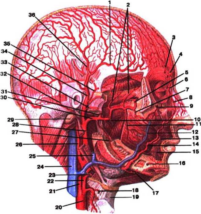 4-a.supratrochlearis; 5-а.maxillaris (pars sphenopalatina); 6-а.dor-salis nasi; 7-.alveolaris superior posterior; 8-а.angularis; 9-a.infraorbitalis; 10-a.masseterica; 11-а.buccalis; 12-v.facialis; 13-а.labialis superior; 14-a.facialis; 15-а.labialis inferior; 16-а.mentalis; 17-a.submentalis; 18-а.laryngea superior; 19-membrana thyrohyoidea; 20-a.carotis communis; 21-а.carotis interna; 22-a.carotis externa; 23-a.lingualis; 24-v.jugularis interna; 25-v.retromandibulars; 26-a.occipitalis; 27-a.alveolaris inferior; 28-a.carotis externa; 29-processus mastoideus; 30-a.maxillaris (pars mandibularis); 31-a.meningea media; 32-a.auricularis posterior; 33-a.transversa faciei; 34-a.temporalis superficialis; 35-a.temporalis media; 36-r.parietalis a.temporalis superficialis.