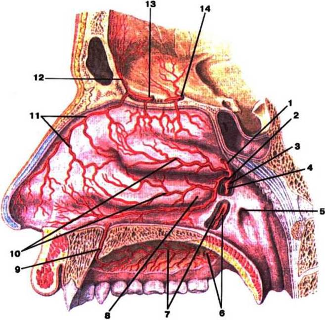 Малюнок 20. Артерії носової порожнини (внутрішня поверхня бічної стінки). 1-a.nasoseptalis posterior; 2-а.8рпепораіаїіпа; 3-a.canalis pterygoidei; 4-a.palatina descendens; 5-ostium pharyngeum tubae auditivae; 6-a.palatina minor; 7-а.palatina major; 8-concha nasalis inferior; 9-a.canalis incisivus (a.nasopalatina); 10-aa.nasales posteriores laterales; 11-aa.ethmoidales anteriores; 12-a.meningea anterior; 13-а.ethmoidalis anterior; 14-a.ethmoidalis posterior.