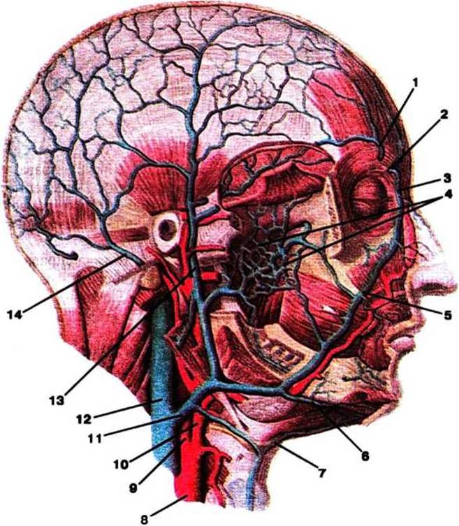 1-v.supratrochlearis; 2-v.nasofrontalis; 3-v.angularis; 4-plexus pterygoideus; 5-v.facialis; 6-v.submentalis; 7-v.jugularis anterior; 8-а.carotis communis; 9-a.carotis interna; 10-a.carotis externa; 11-v.facialis; 12-v.jugularis interna; 13-v.temporalis superficialis; 14-v.auricularis posterior.