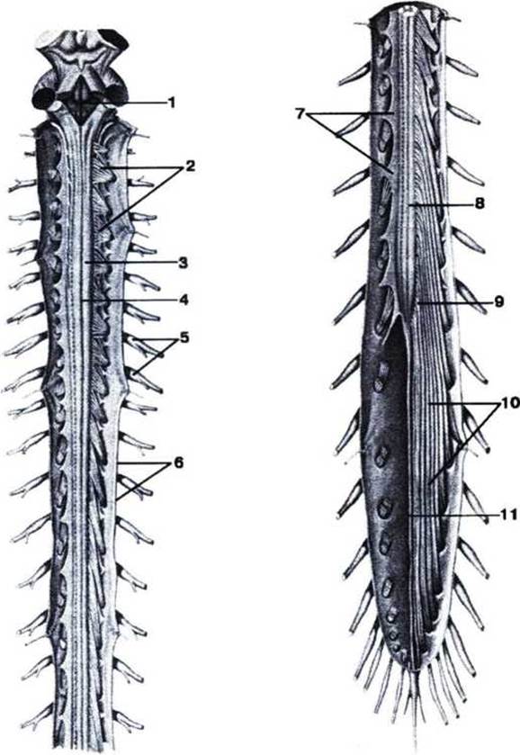 1-fossa rhomboidea; 2-radices nervorum spinalis; 3-intumescentia cervicalis; 4-sulcus medianus posterior; 5-nervi spinalis; 6-dura mater medullae spinalis; 7-ligamentum denticulatum; 8-intumescentia lumbosacralis; 9-conus medullaris; 10-cauda equina; 11-filum terminale.
