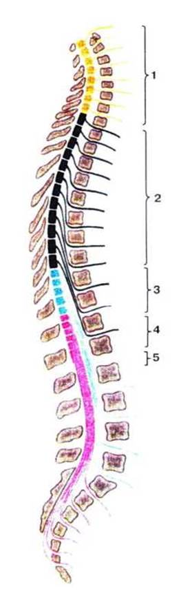1-pars cervicalis (segmenta C1-C8); 2-pars thoracica (segmenta Th1 -Th2); 3-pars lumbalis (segmenta L1-L5); 4-pars sacralis (segmenta S1-S5); 5-pars coccygea (segmenta Co1 -Сo3).