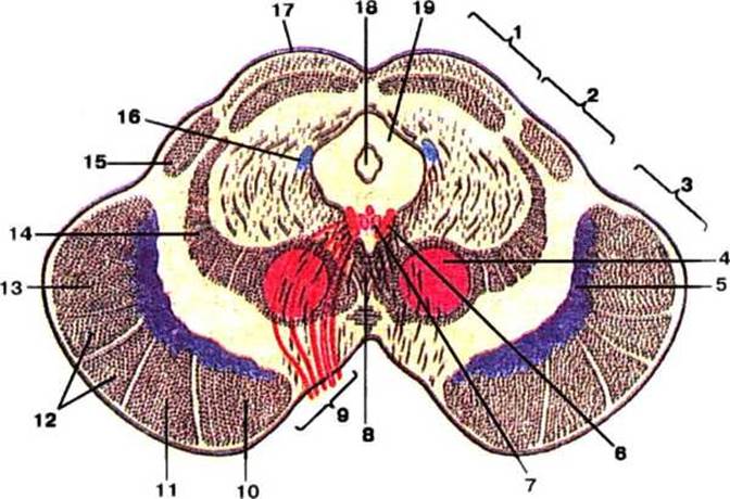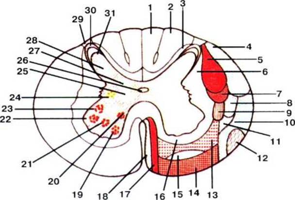 7-tractus rubrospinalis; 8-tractus spinothala-micus lateralis; 9-tractus vestibulospinalis posterior; 10-tractus spinocerebellaris anterior 11-tractus olivospinalis; 12-tractus reticulospinalis; 13-tractus vestibulospinalis; 14-tractus spinotalamicus anterior; 15-fascisulus proprius (anterior); 16-tractus corticospinalis (pyramidalis) anterior; 17-tractus tec-tospinalis; 18-nucleusanteromedialis; 19-nucleusposteromedialis; 20-nucleus centralis; 21-nucleus anterolateralis; 22-nucleus posterolateralis; 23-nucleus intermediolateralis; 24-nucleus intermedius; 25-canalis centralis; 26-nucleus thoracicus; 27-nucleus proprius (BNA); 28-zona terminalis (BNA); 29-stratum sponguosum; 30-substantia pulposa; 31-substantia gelatinosa.