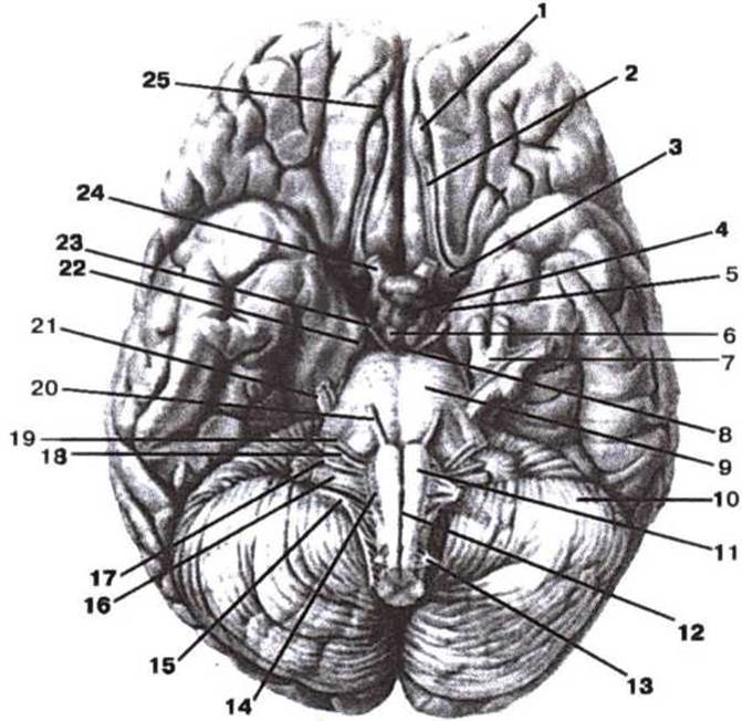 1-bulbus olfactorius; 2-tractus olfactorius; 3-substantia perforata anterior; 4-tuber cinereum; 5-tractus opticus; 6-corpus mamillare; 7-ganglion trigemi-nale; 8-substantia perforata posterior; 9-pons; 10-cerebellum; 11-pyramis; 12-fissura mediana anterior; 13-nervus spinalis; 14-nervus hypoglossus; 15-nervus accessorius; 16-nervus vagus; 17-nervus glossopharyngeus; 18-nervus vestibulocochlearis; 19-nervus facialis; 20-nervus abducens; 21-nervus trigeminus; 22-nervus trochlearis; 23-nervus oculomotorius; 24-nervus opticus; 25- gyrus rectus.