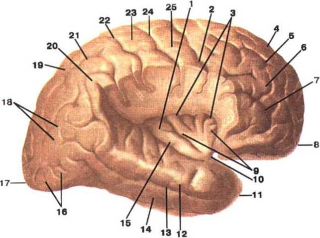 1-insula; 2-sulcus precentralis; 3-suIcus circularis insulae; 4-gyrus frontalis superior; 5-sulcus frontalis superior; 6-gyrus frontalis medialis; 7-sulcus frontalis inferior; 8-polus frontalis (anterior); 9-gyri breves insulae; 10-limen insulae; 11-polus temporalis; 12-gyrus temporalis superior; 13-sulcus temporalis superior; 14-gyrus temporalis medialis; 15-gyrus longus insulae; 16-gyri occipitales laterales; 17-polus occipitalis (posterior); 18-gyrus angularis; 19-lobulus parietalis superior; 20-gyrus supramarginalis; 21-sulcus intraparietalis; 22-sulcus postcentralis; 23-gyrus postcentralis; 24-sulcus centralis; 25-gyrus precentralis.