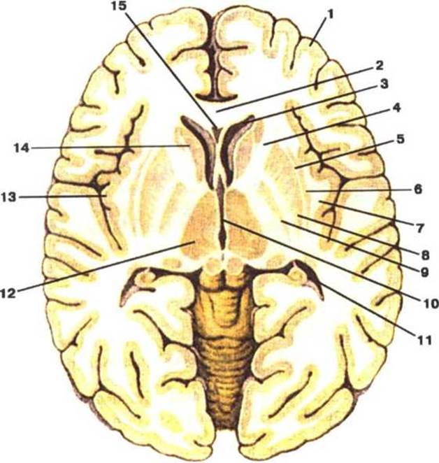 Малюнок 30. Nuclei basales et capsula interna. Горизонтальний розріз. Вид зверху. 1-cortex cerebri; 2-genu corporis callosi; 3-cornu anterius ventriculi lateralis; 4-capsula interna; 5-capsula externa; 6-claustrum; 7-capsula externa; 8-putamen; 9-globus pallidus; 10-ventriculustetrius; 11-cornuposterius ventriculi lateralis; 12-thalamus; 13-cortex insulae; 14-caput nuclei caudati; 15-cavum septi pellucidi.