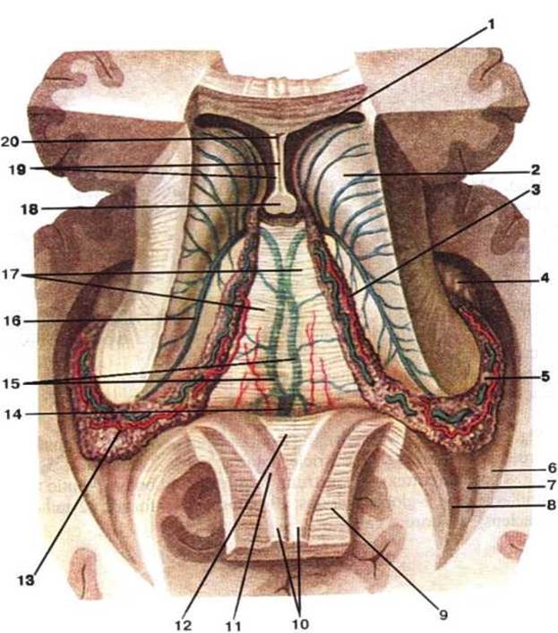1-cornu anterius ventriculi lateralis; 2-nucleus caudatus; 3-plexus choroideus ventriculi lateralis (partis centralis); 4-pes hippocampi; 5-plexus choroideus ventriculi lateralis (cornu inferior); 6-eminentia collateralis; 7-calcar avis; 8-bulbus cornus posterioris; 9-corpus callosum; 10-corpus fornicis; 11-eras fornicis; 12-comissura fornicis; 13-arteria choroidea; 14-vena cerebri magna; 15-vena cerebri interna; 16-vena thalamostriata superior; 17-tela choroidea vascularis ventriculi tertii; 18-columnae fornicis; 19-lamina septi pellucidi; 20-cavum septi pellucidi.