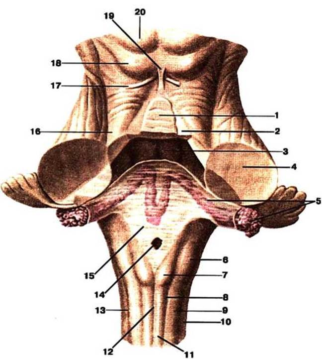Малюнок 33.Nfenticulus quartis et tela choroidea ventriculi quarti. Вигляд зверху. 1-lingula cerebelli; 2-vellum medullare superius; 3-IV ventriculus; 4-pedun-culus cerebellaris medius; 5-plexus choroideus ventriculi guarti; 6-tuberculum cuneatum; 7-tuberculum gracile; 8-sulcus intermedius posterior; 9-fas-ciculus cuneatus; 10-funiculus lateralis; 11-fasciculus gracilis; 12-sulcus medianus posterior; 13-sulcusdorsolateralis; 14-apertura mediana ventriculi guarti; 15-tela choroidea ventriculi guarti; 16-pedunculus cerebellaris superior; 17-nervus trochlearis; 18-colliculus inferior (tecti menescephali); 19-frenulum veli medullaris superioris; 20-colliculus superior (tecti menescephali).