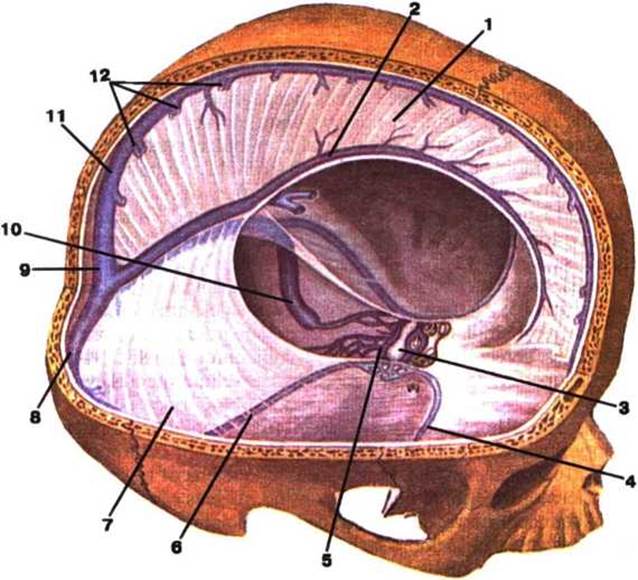 1-falx cerebri; 2-sinus saggitalis inferior; 3-sirius intercavernosus anterior; 4-sinus sphenoparietalis; 5-sinus intercavernsus posterior; 6-sinus petrosus superior; 7-tentorium cerebelli; 8-sinus transversus; 9-confuens sinuum; 10-sinus sigmoidus; 11-sinus sagittalis superior; 12-v v.superiores cerebri.