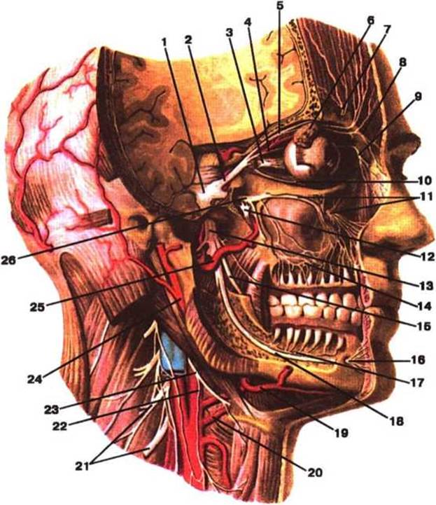 1-ganglion trigeminus; 2-nervus ophtalmicus; 3-ganglion cilaris; 4-nervus nasolacrimalis; 5- nervus frontalis; 6-glandula lacrimalis; 7-nervus supraorbitalis; 8-nervus supratrochlearis; 9- nervus infratrochlearis; 10-nervus oculo-motorius; 11-nervus infraorbitalis; 12-ganglion pterygopalatinus; 13-nervus mandibularis; 14-plexus dentalis superior; 15-nervus lingualis; 16-nervus mentalis; 17-plexus dentalis inferior; 18-nervus alveolaris inferior; 19-arteria facialis; 20-arteria lingualis; 21-plexus cervicalis; 22-radix superior (ansae cervicis); 23-nervus hypoglossus; 24-arteria corotis externa; 25-arteria maxillaris; 26-nervus maxillaris.