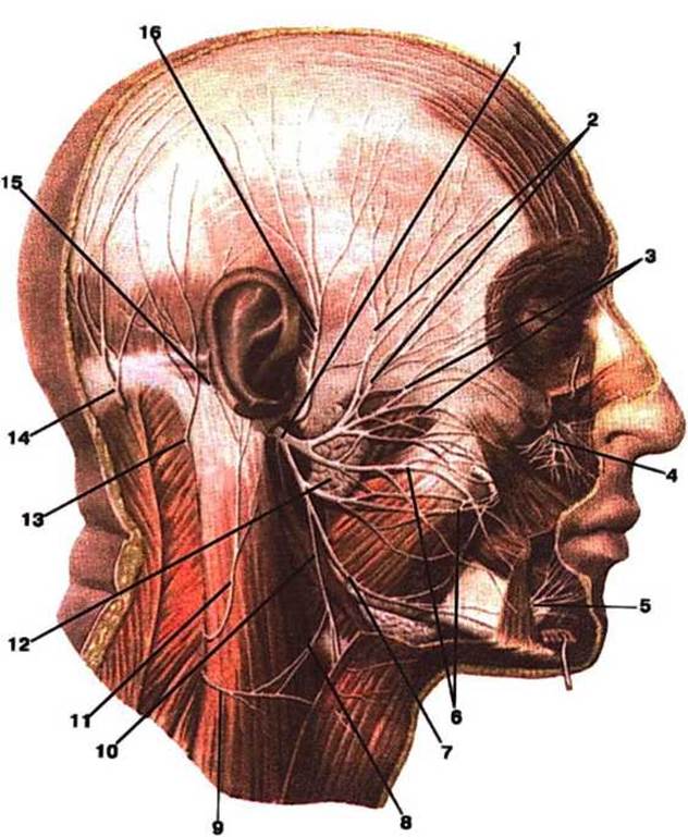 1-n.facialis; 2-rr.temporales; 3-rr.zygomatici; 4-n.infraorbitalis; 5-n.mentalis; 6-rr.buccales; 7-r.marginalis mandibulae; 8-ansa colli superficialis; 9-n.transversus colli; 10-r.colli;11-n.auricularis magnus; 12-glandulla parotis; 13-n.occipitalis minor; 14-n.occipitalis major; 15-n.auricularis posterior (n.facialis); 16-n.auriculotemporalis.