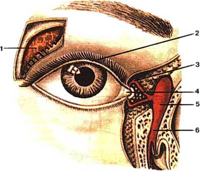 1-glandula lacrimalis; 2-palpebra superior; 3-canaliculus lacrimalis superior; 4-lacus lacrimalis; 5-saccus lacrimalis; 6-ductus nasolacrimalis.