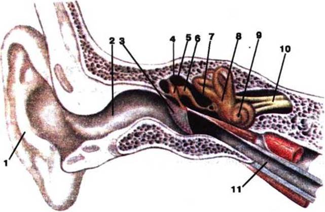 1-auricula; 2-meatus acusticus externus; 3-membrana tympani; 4-cavitas tympani; 5-malleus; 6-incus; 7-stapes; 8-vestibulum; 9-cochlea; 10-n.vestibulocochlearis; 11-tuba auditiva.