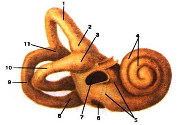 1-canalis semicircularis anterior; 2-ampulla ossea anterior; 3-ampulla ossea lateralis; 4-cochlea; 5-vestibulum; 6-fenestra cochleae (fenestra rotundum); 7-fenestra vestibuli (fenestra ovale); 8-ampuIla ossea posterior; 9-canalis semicircularis posterior; 10-canalis semicircularis lateralis; 11-crus osseum commune.