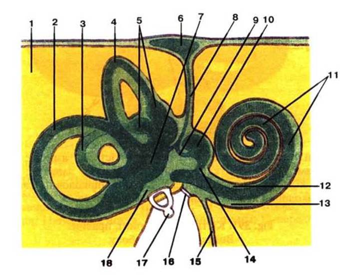 1-substantia ossea pyramidis ossis temporalis; 2-ductus semicircularis posterior; 3-ductus semicircularis lateralis; 4-ductus semicircularis anterior; 5-ampullae ductuum semicircularium; 6-saccus endolymphaticus; 7-utriculus; 8-ductus endolymphaticus; 9-ductus utriculosaccularis; 10-sacculus; 11-ductus cochlearis; 12-scala vestibuli; 13-scala tympani; 14-ductus reuniens; 15-canaliculus spiralis cochleae; 16-membrana tympani secundaria; 17-stapes; 18-vestibulum.
