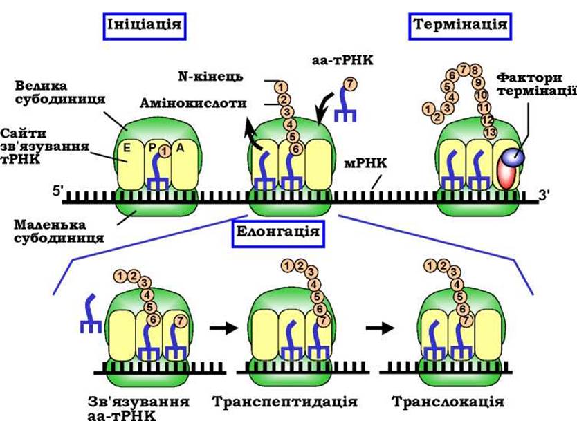 Рис. 2.4. Схема процесу трансляції. У нижній частині показано події одного елонгаційного циклу