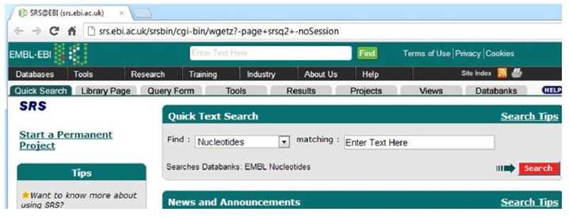 Система выборки последовательностей SRS (Sequence Retrieval System) является сетевым браузером баз данных молекулярной биологии. Она была разработана с целью предоставления пользователям EMBnet дополнительных сервисных услуг. Интернет-адрес SRS следующий: http://srs.ebi.ac.uk/ (рисунок 4). SRS позволяет вносить любую одноуровневую базу данных в предметный указатель любой другой базы данных.
