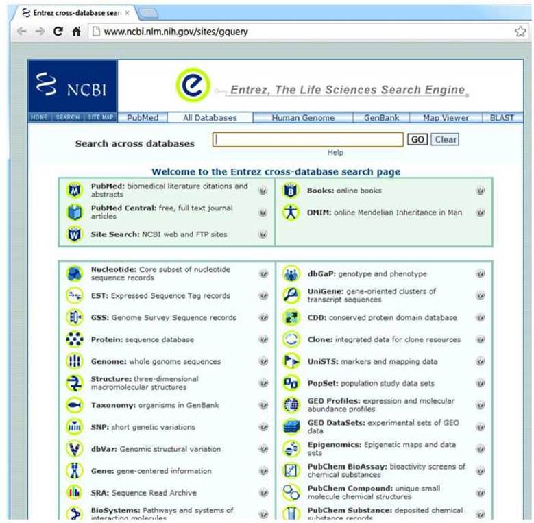 Entrez. Подобно SRS для сети EMBnet, в NCBI был разработан браузер Entrez (http://www.ncbi.nlm.nih.gov/sites/gquery) с целью обеспечения выборки данных молекулярной биологии (а также организации ссылок на библиографические источники) из баз данных, объединённых в NCBI (рисунок 5).