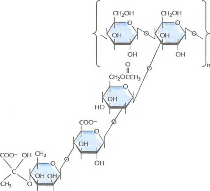 Рис. 12.18. Структурная формула полисахарида, образующего ксантановую слизь. Каркас составляет линейная полимерная цепь из молекул глюкозы. К каждому второму остатку присоединена трисахаридная боковая цепь.