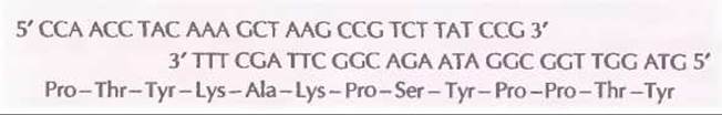 Рис. 12.20. Синтетический олигонуклеотид, послуживший основой для создания гена адгезивного белка, синтезируемого мидией М. edulis. Второй синтетический олигонуклеотид был синтезирован таким образом, чтобы после отжига с первым образовывался фрагмент двухцепочечной ДНК с липкими концами. Последующее лигирование с помощью ДНК-лигазы фага Т4 привело к образованию линейной ДНК, состоящей из представленных на рисунке повторов. Внизу дана аминокислотная последовательность полипептида, кодируемого этим повтором.