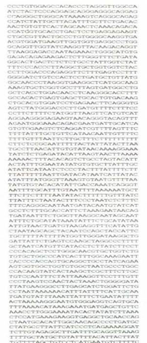 Рис. 3-9. Последовательность ДНК гена ß -глобулина человека (одной из двух субъединиц молекулы гемоглобина, переносящего кислород в крови взрослого человека). Показана только одна из двух цепей ДНК («кодирующая цепь»), вторая цепь имеет комплементарную последовательность. Последовательность следует читать слева направо, строка за строкой, как обычный текст.
