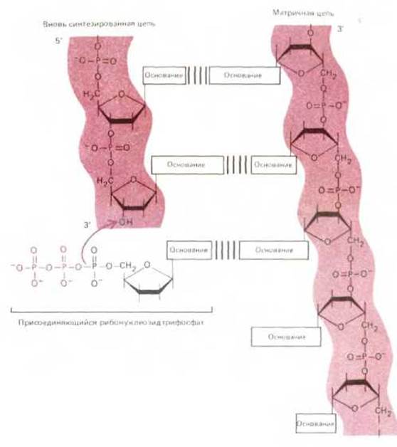 РНК сохраняет все информационное содержание той ДНК, копией которой она является, а также способность к спариванию комплементарных оснований. Синтез молекул РНК называется транскрипцией ДНК; во многих отношениях он аналогичен репликации ДНК. Одна из цепей ДНК служит матрицей, на которой испытывается способность очередных нуклеотидов к комплементарному спариванию. При хорошем соответствии с ДНК-матрицей рибонуклеотид включается в растущую цепь РНК как ковалентно связанная составная часть. Таким способом цепь РНК удлиняется последовательным добавлением одного нуклеотида.