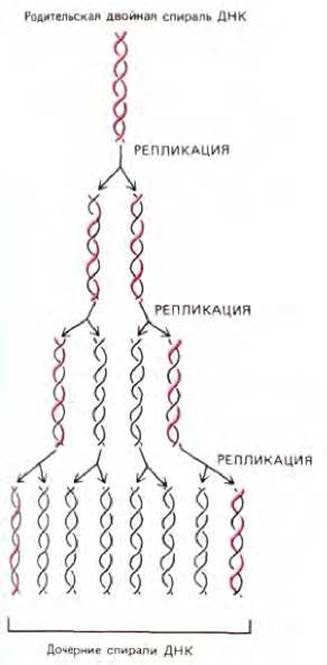 Биологическая информация записана в гене в такой форме, что она может точно копироваться и передаваться клеткам-потомкам. Огромное значение расшифровки структуры ДНК состоит в том, что предложенная Уотсоном и Криком модель позволила сформулировать общие принципы важнейшего процесса передачи генетической информации. Поскольку каждая цепь содержит последовательность нуклеотидов, в точности комплементарную последовательности цепи-партнера, то на деле обе цепи несут одну и ту же генетическую информацию. Если обозначить две цепи А и А', то цепь А служит шаблоном, или матрицей, для образования новой цепи А', а цепь А' может играть ту же роль в образовании новой цепи А. Таким образом, Генетическая информация может копироваться при разделении цепей А и А', что позволяет каждой из них служить матрицей для образования нового комплементарного партнера.