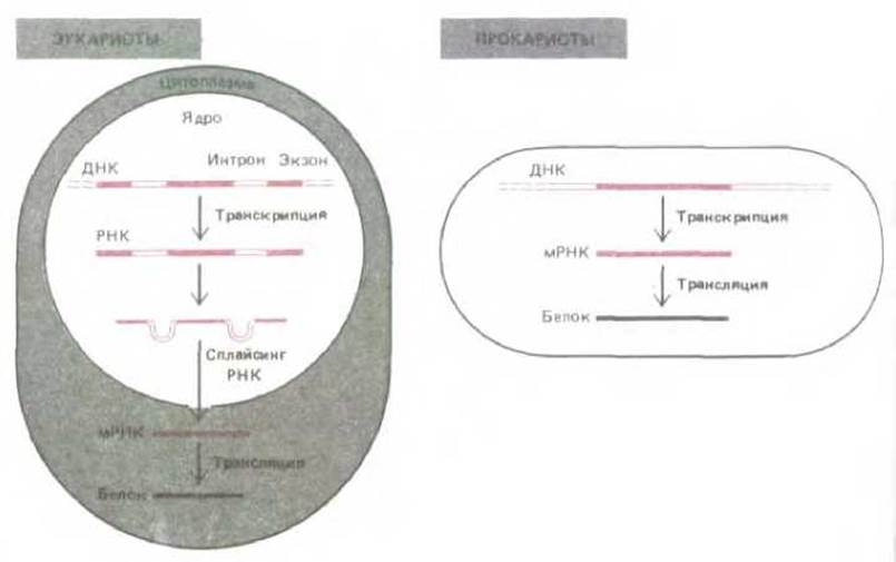Рис. 3-13. Передача информации от ДНК к белку осуществляется с помощью РНК-посредника, называемого мРНК. У прокариотических клеток этот процесс проще, чем у эукариотических. У эукариот кодирующие участки ДНК-экзоны (выделены цветом) разделены некодирующими участками (интронами). Показано, что для образования мРНК интроны должны удаляться.