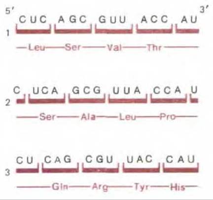 Рис. 3-14. Три рамки считывания, возможные при синтезе белка. Последовательность нуклеотидов РНК считывается по порядку от 5'- к 3'-концу по три нуклеотида и таким образом переводится в последовательность аминокислот. Поэтому одна и та же последовательность РНК может в принципе в зависимости от «рамки считывания» кодировать три совершенно различные последовательности аминокислот.