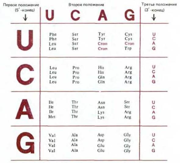 Рис. 3-15. Генетический код. При синтезе белка триплеты нуклеотидов РНК (кодоны) транслируются в соответствующие им аминокислоты. Например, кодоны GUG и GAG направляют в белок соответственно валин и глутаминовую кислоту. Обратите внимание, что кодоны с U или С во втором положении обычно кодируют более гидрофобные аминокислоты (схема 2-5).