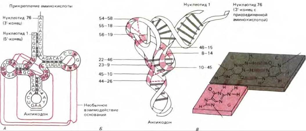 Каждая молекула тРНК имеет характерную пространственную структуру, поддерживаемую теми же нековалентными взаимодействиями, которые удерживают вместе две цепи в двойной спирали ДНК. Однако в одноцепочечной молекуле тРНК комплементарное спаривание между нуклеотидными основаниями происходит в пределах одной цепи. Это приводит к тому, что молекула тРНК принимает определенную конформацию, существенную для выполнения функций адаптора. Четыре коротких сегмента молекулы образуют двухспиральную структуру, придающую молекуле вид двумерного «кленового листа». Этот кленовый лист в свою очередь упаковывается в многоскладчатую L-образную фигуру, которая скрепляется более сложными взаимодействиями на основе водородных связей (рис. 3-16). Два набора неспаренных нуклеотидных остатков по обоим концам «L» играют особенно важную роль для функционирования молекулы тРНК в биосинтезе белка: один из них образует антикодон, способный спариваться с комплементарным триплетом молекулы мРНК (кодоном); другой, имеющий последовательность ССА на 3'-конце молекулы, ковалентно связывается со специфической аминокислотой (рис. 3-16, А).