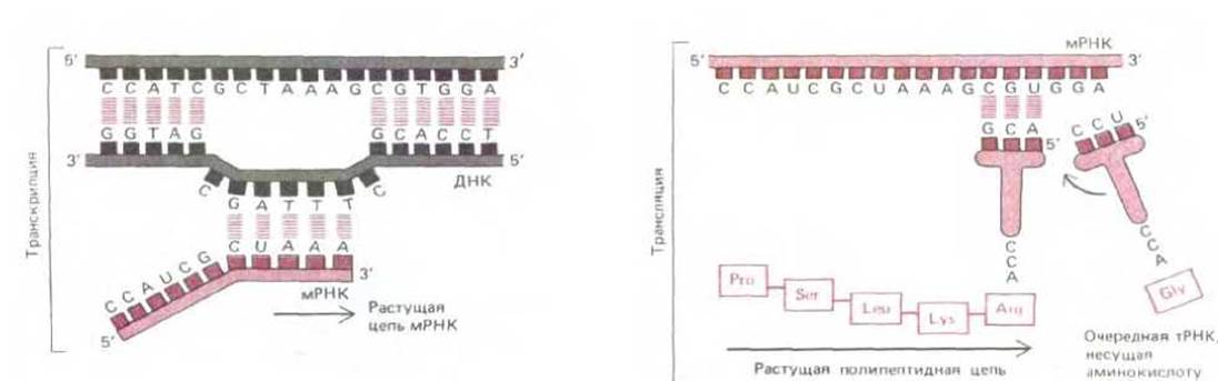Экспрессия генетической информации, заключенной в ДНК, осуществляется путем трансляции линейной последовательности нуклеотидов в колинеарную последовательность аминокислот белка. Сначала ограниченный участок ДНК копируется на комплементарную цепь РНК. Этот первичный транскрипт РНК подвергается сплайсингу для удаления интронных последовательностей и превращается в молекулу мРНК. В конце концов мРНК транслируется с образованием белка путем сложного набора реакций, происходящих в рибосоме. Вначале аминокислоты, используемые для синтеза белка, прикрепляются к семейству молекул тРНК, каждая из которых путем комплементарного спаривания оснований узнает набор из трех нуклеотидов мРНК. Последовательность нуклеотидов мРНК считывается с одного конца к другому триплетами нуклеотидов в соответствии с универсальным генетическим кодом.