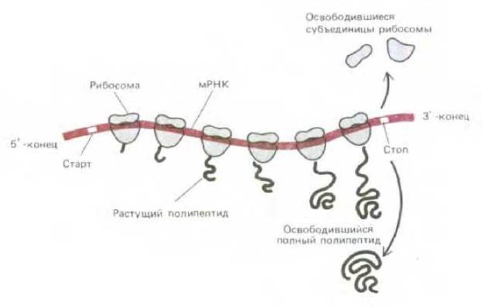 Рис. 3-18. Схема синтеза белка на рибосомах. Рибосомы присоединяются к стартовому сигналу вблизи 5'-конца молекулы мРНК и передвигаются к З'-концу, синтезируя по пути белок. Часто по одной молекуле мРНК движутся одновременно несколько рибосом, синтезируя несколько идентичных полипептидных цепей; такая структура в целом называется полирибосомой.