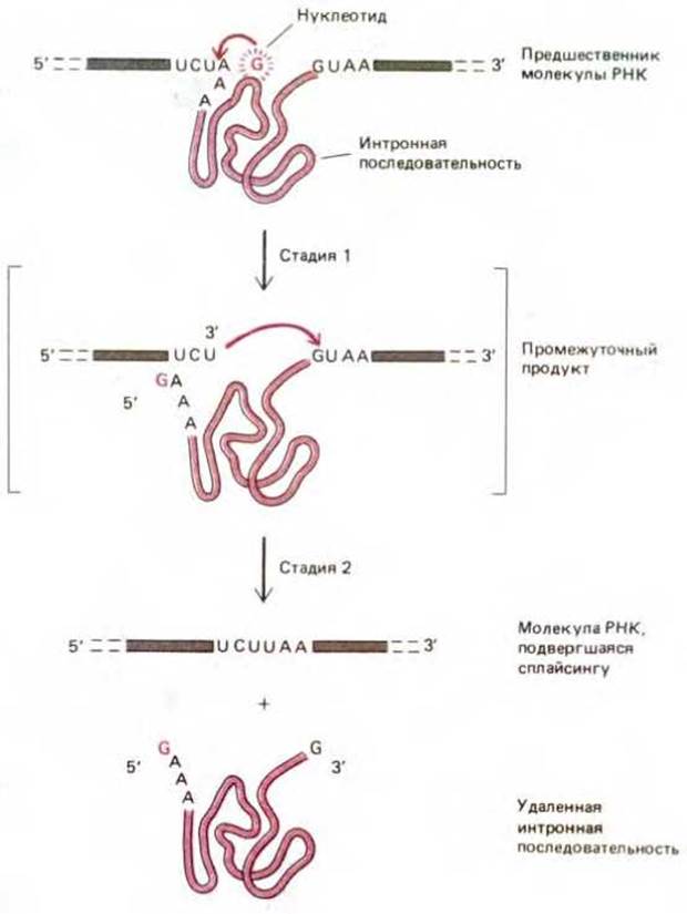 Когда-то молекулы РНК рассматривались как цепочка нуклеотидов с относительно неинтересными химическими свойствами. В 1981 г. эта точка зрения была поколеблена открытием каталитической молекулы РЫК с такими изощренными химическими свойствами, которые биохимики раньше связывали только с белками. Рибосомные молекулы РНК ресничного простейшего Tetrahymena вначале были синтезированы как большая группа предшественников. Было показано, что одна из рРНК получается путем реакции сплайсинга РНК. Удивительным в этом открытии было то, что сплайсинг можно осуществить in vitro в отсутствие белка. Позже было показано, что сама интронная последовательность обладает ферментоподобной активностью и может катализировать двухступенчатую реакцию, показанную на рис. 3-19.